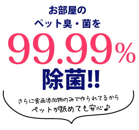 【ペットが舐めても安心】 万が一ペットが舐めてしまっても安心!皮膚に直接付着しても安心、安全、無害!! 【さまざまな悪臭を強力消臭】 空間全体や、臭いがしみついた布製品など、サッとスプレーするだけで、瞬間消臭します。
